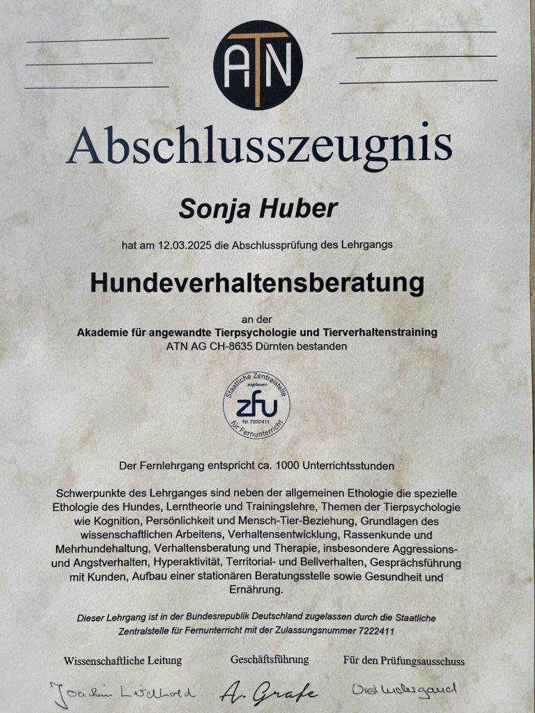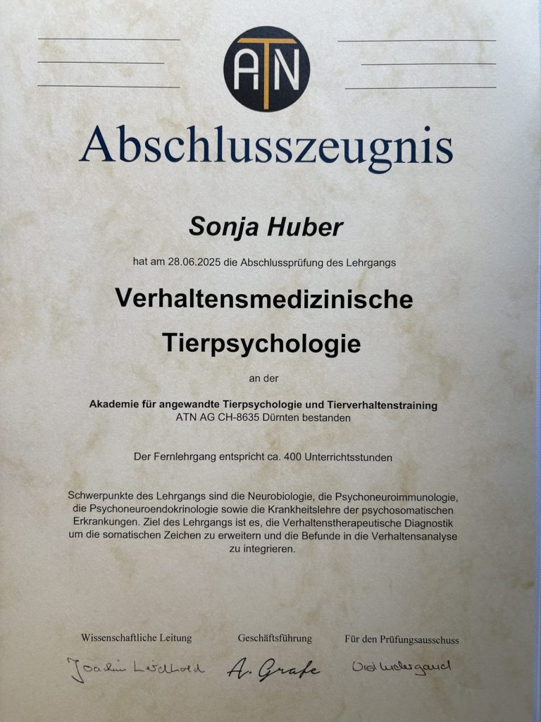 Seit November 2023 absolviere ich die Ausbildung zur Hundeverhaltensberaterin bei der ATN. Die theoretische Prüfung habe ich im März 2025 bereits erfolgreich absolviert. Die mündlich/praktische Prüfung erfolgt im November 2025.